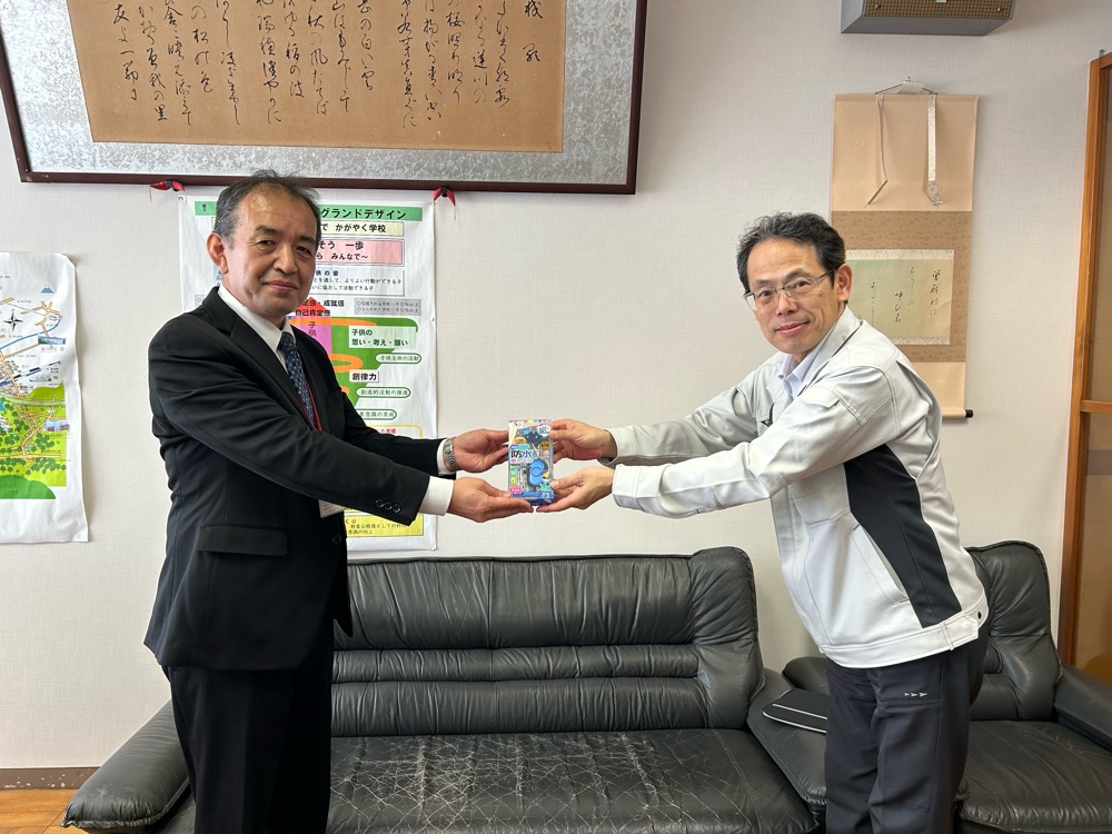 3月2日に松浦会長が地元の曽我小学校を訪問し、後藤校長先生に1年生44名分の防犯ブザーを手渡しました。